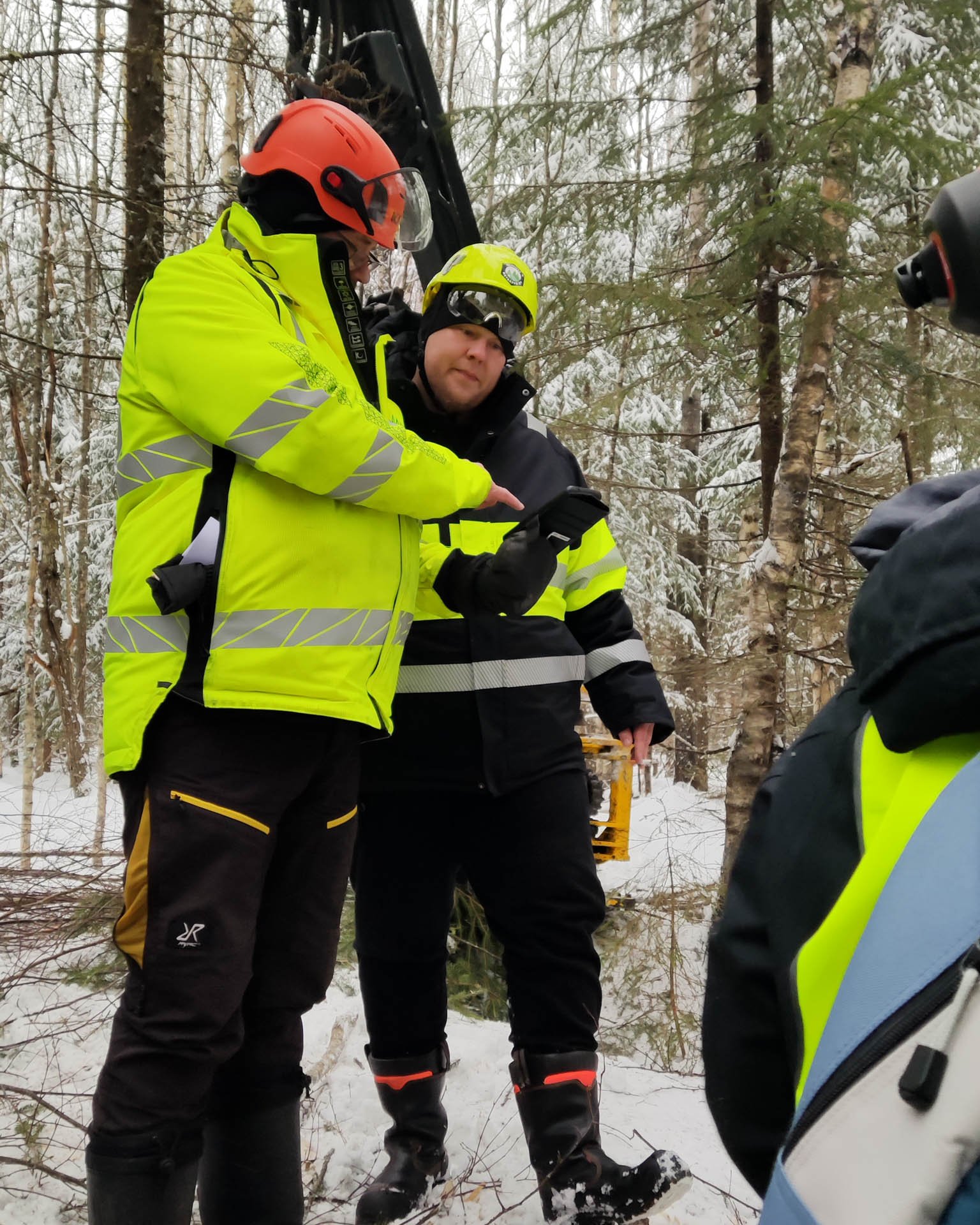 Kuva 1: Metsäasiantuntija käy työkoneenkuljettajan kanssa läpi turvakävelyä, joka tehdään kaikilla Laanian metsätyömailla.